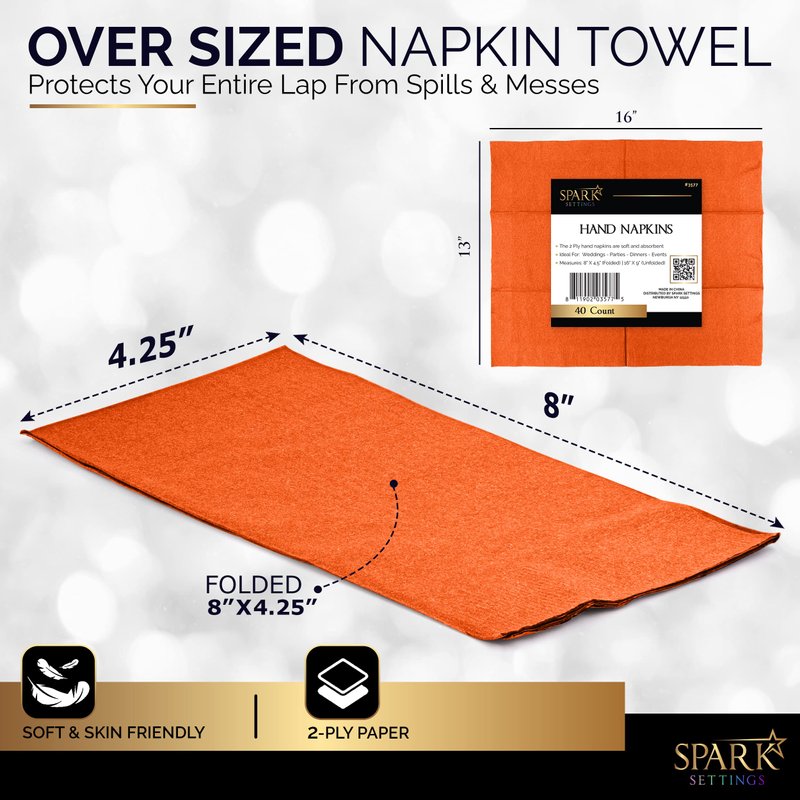- ✓SPECS - Dinner napkins paper are disposable 2-ply paper guest hand towels. Disposable dinner napkins bright and vibrant colors black orange clear lime purple white blue green red pink gold burgundy and Silver. Napkins bulk are folded 8” x 4.5” and comes in 40 packs and serve with any beverage.