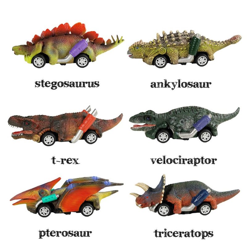 - [DINOSAUR TOYS] The 6 distinct dinosaur cars designed as a roadster pull back car toy make great toys for boys or girls. The dino toys make a great birthday gift or a special toy to give to any child who loves dinosaurs.