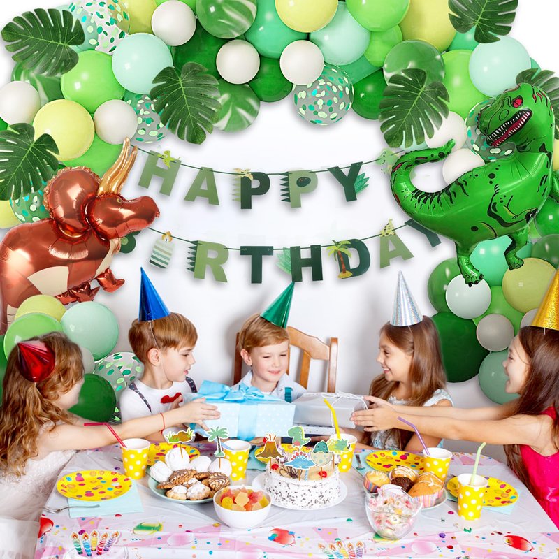 - Valued Kits: To throw a dinosaur party, we have all right dinosaur party decorations for your party needs in the box. Save time and money through buying all dinosaur party decorations as a set rather than searching around and buying one by one. And our dinosaur party decorations set for many scenes: dinosaur birthday party, jungle theme party, safari party, green theme party, baby shower, home garden decoration, family reunions and other holiday decorations.