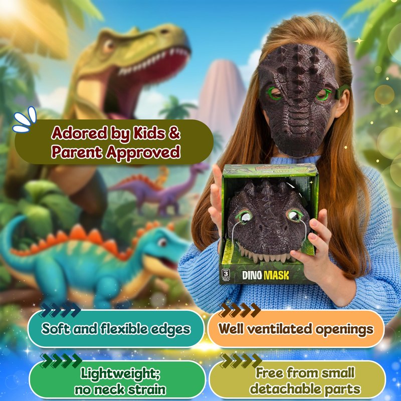 - 🦖 CHILD SIZE WITH AN EASY AND SECURE WEAR - The mask covers most of the face leaving the eyes and part of the mouth exposed for breathability. Children can manipulate the mask easily as it features an elastic strap to hold the mask in place around the back of the head for comfortable wear during dress up and pretend playtime.