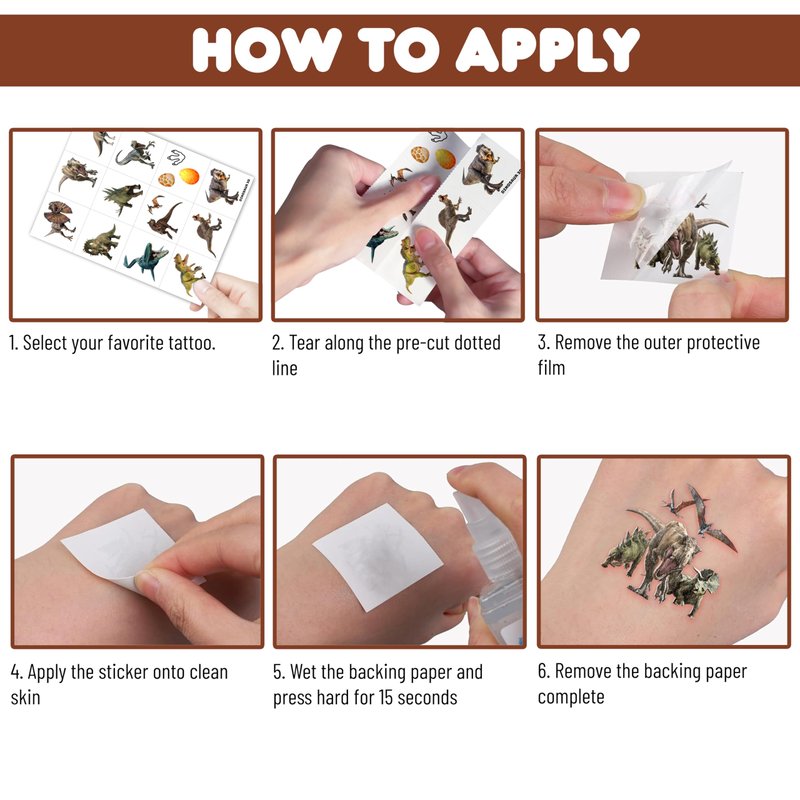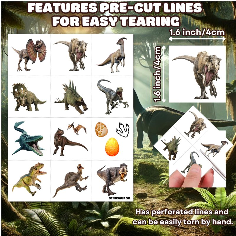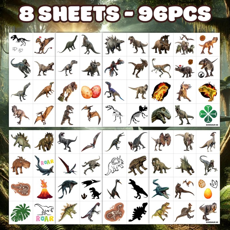 🦖【PERFECT TATTOOS FOR THEMED DINOSAUR DECORATIONS】: DINOSAUR temporary tattoo stickers include 8 SHEETS in total. There are 96 PCS super cute tattoo differences. Perfect for giving out party favors and holiday theme small gifts. The size of each sheet is 6.3 * 4.7 inches. One size fits kids. 🎁【GREAT GIFT IDEAS FOR DINOSAUR PARTY SUPPLIES AND DECORATIONS】: You will receive many compliments when you decorate your child's birthday party with a DINOSAUR, 3D dinosaur, dino, Herbivorous dinosaurs, Tyrannosaurus Rex, Dinosaur eggs, Paleontology, Fossils, Prehistoric, theme. DINOSAUR tattoos are a small gift you should not pass up for your kids. 🌍【SAFE AND ENVIRONMENTALLY CONSCIOUS】: Our Dinosaur temporary tattoos are made from materials that are safe and prioritize sustainability. These tattoos are created using paper that is both safe for users and friendly to the environment. 🥳【ADD A TOUCH OF FUN】: Are you tired of mundane gifts? We've got you covered! Our collection of adorable and vibrant dinosaur temporary tattoo designs can be applied to laptops, backpacks, desks, suitcases, books, water cups, and more. These playful elements will surely elevate your visual experience and bring a touch of joy to everyday items. 🌴【EASY TO USE AND REMOVE】: Cut each tattoo out of sheets and remove the sheet clearly. You can stick it on your hands, face, arms or wherever you feel safe. Moreover, you put it down on glasses, clothes, and a smooth flat . After that, you wet it thoroughly with water and wait for 20-30 seconds, you get rid of the backing paper. As a result, you have a velvety tattoo as we say. 👍【PERFECT SERVICE】: If you have difficulty using our product, contact us. We will make sure to solve problems and help you have a wonderful buying experience. 🙉【 Not recommended for people with a history of sensitive skin, if symptoms appear, stop using immediately】 ⚠️This product is not recommended for individuals with sensitive skin. We advise testing the product on a small patch of skin, such as the hand, to check for any allergic reactions to the ingredients before applying it to other areas of the body