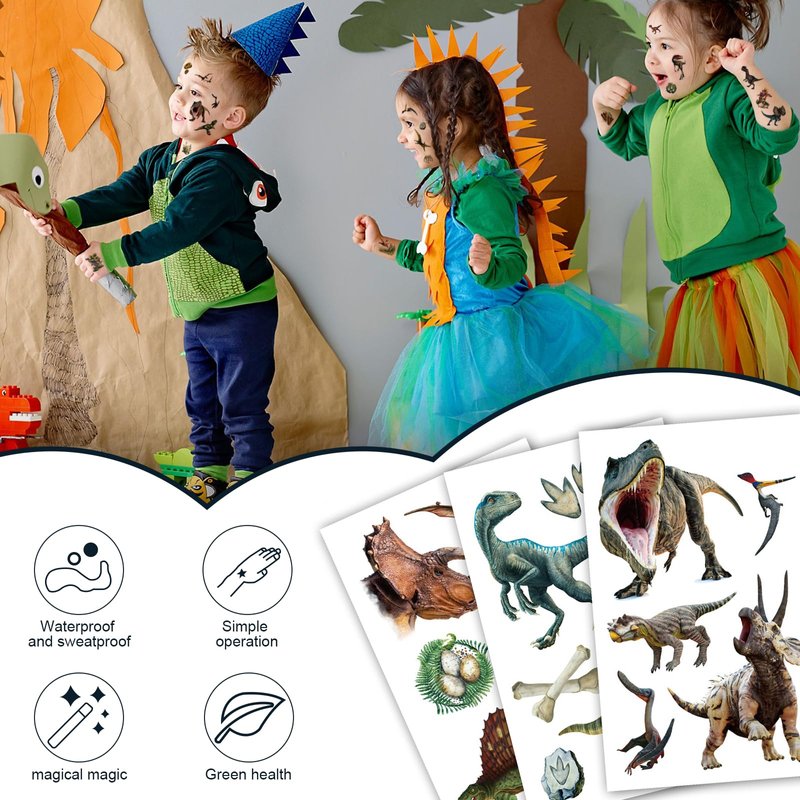 - Material:The dinosaur tattoo sticker is made of high-quality paper and covered with film, which is not easy to fade, durable and waterproof.With these dinosaur theme temporary tattoos will provide big fun for both children and adults alike!