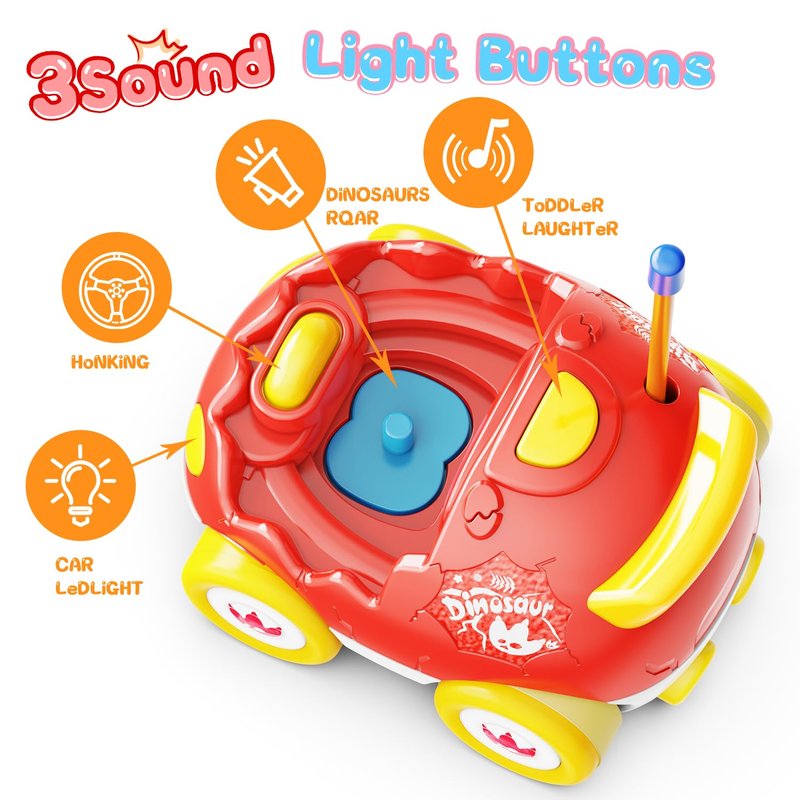 - 【A set with 2 remote control cars】 This is a set of two egg-shaped remote control cars for toddlers with music, sound, and light features, two interchangeable dinosaur figures, and two remote controls that move the cars forward and backward left.