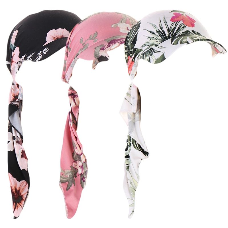 DINPREY Long Pretied Head Scarves for Women Bandana Turban Hat Chemo Cancer Headscarf Headwraps Headwear for bald women hair wraps Hair Cover Hat (3 PCS Flower)