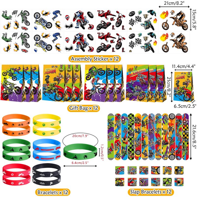 Dirt Bike Party Favor Supplies, Including Gift Bag Tattoo Stickers Badge Slap Bracelets Silicone Wristbands DIY Stickers Keychain, for Motorcycle Theme Party Club Gift Boy Birthday Party Fillers