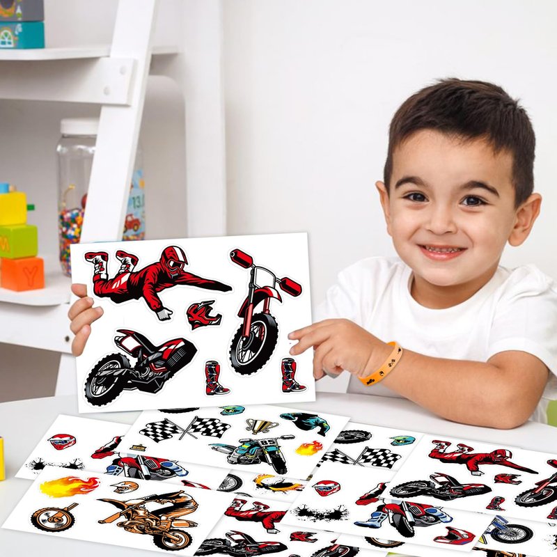 - Super Value Kids Construction Gifts Set: Includes 12 wristbands, 50 luggage stickers, 12 gift bags, 12 tattoo stickers, 12 dirt bike key chains,12 slap bracelets, 12 DIY stickers (4 styles), and 12 dirt bike theme button badges, which is enough for kids to share with others to have fun, and you can pack these in the party bags as giveaways for guests.