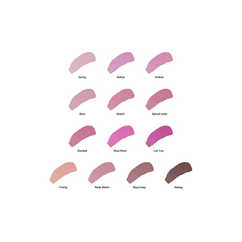 This Gloss comes in 13 different shades: Pinkish, Stacked, Spiced Latte, Rose Petal, Bare, Nude Beach, Guilty, Smash, Boy Crazy, Liar Liar, Selfish, Trashy, Vampy