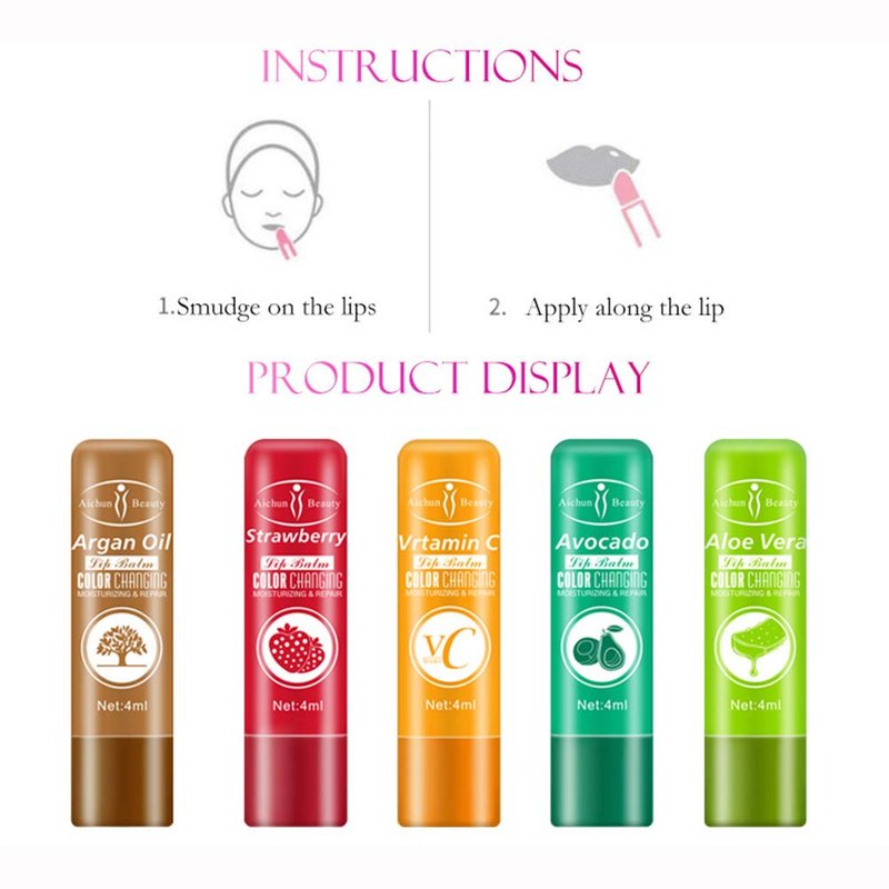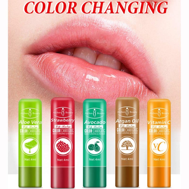 SPECIFICATIONS: LIP BALM CHANGING THE COLOR OF Puffy Nourishing Lipstick. Features: Network: 4 ml. Expiration date: 3 years. Color: 5 colors. Made of waterproof material. Description: Color changing temperature sensor, different colors. Lip moisturizing and repair. Match lip color. Style: Aloe Vera, Avocado, Argan Oil, Vitamin C, Strawberry. Efficacy: moisturizing lips, nourishing, repairing lip damage. Main ingredients: Aloe Vera, Strawberry, Avocado, Argan Oil, Vitamin C. Expiration date: 3 years Package included: 1 piece Brand: Aiсhun. Product Family: Color Changing Lip Balm. Efficacy: hydrating, moisturizing lip lines. Applicable people: General. Brand type: fine domestic products. Specifications: normal specifications. Time to market: 2019. Special Purpose Cosmetics: No Net content: 4ml aloe, 4ml avocado, 4ml argan oil, 4mlVC, 4ml strawberry. Notes: 1. Measurement by hand, please allow 1-3mm error. 2. Due to different display and different light, the picture may not reflect the actual color of the item. Thank you for understanding.