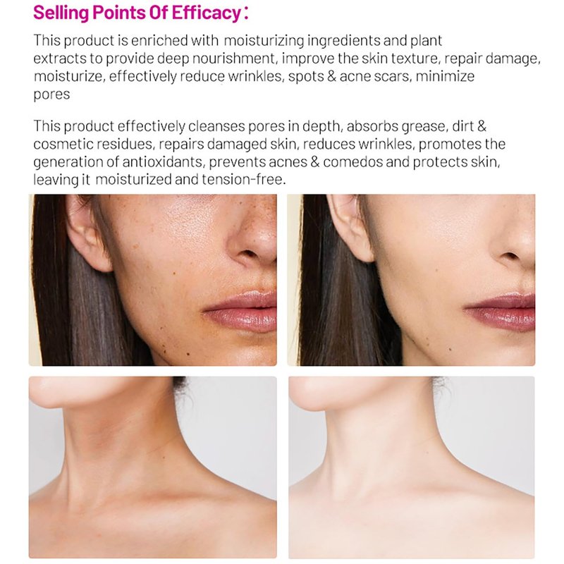 - This product effectively unclogs pores, absorbs oil, dirt and makeup residue, repairs damaged skin, reduces wrinkles, promotes antioxidant production, prevents pimples and comedones and protects skin, hydrated and tension-free.