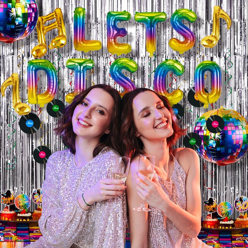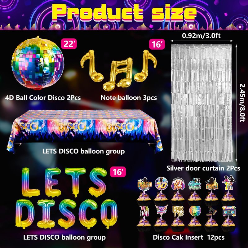 - 🎵Package Includes: 36inch*96inch Silver Door Curtain*2pcs, Film Spiral*12pcs, 108inch*54inch Disco Tablecloth*1pc, LETS DISCO Aluminum Balloons*9pcs, Disco Cake Stickers*12pcs, 22inch 4D Disco Ball Balloons*2pcs, Note Balloons*3pcs