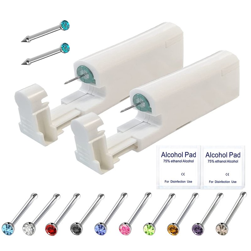 - ✔️【Aseptic packaging】- Medical blister packaging, including 2 pack nose piercing guns - 2 built-in nose studs, 2 pack cleaning pads, 10 pack nose studs.