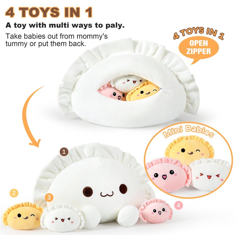 - As Gift: 4 in 1 plush design, mommy and three little dumplings stuffed animal with a vivid kawaii face, more special is its zipper design, you can open or close its zipper, which is interesting and creative. We believe it will be a sweet gifts for parent-child, couple, friend, family on Christmas, Thanksgiving and birthday.
