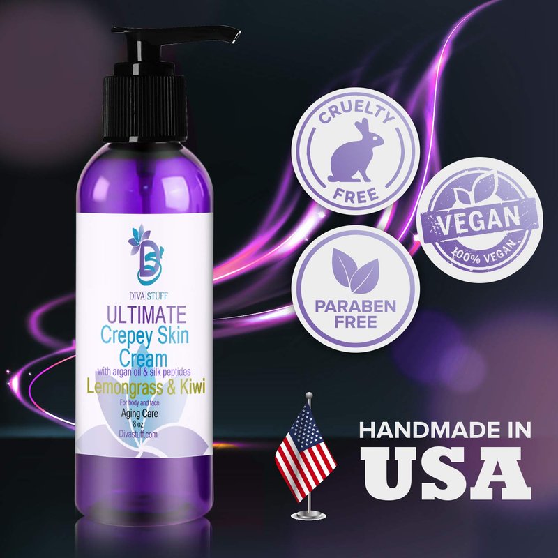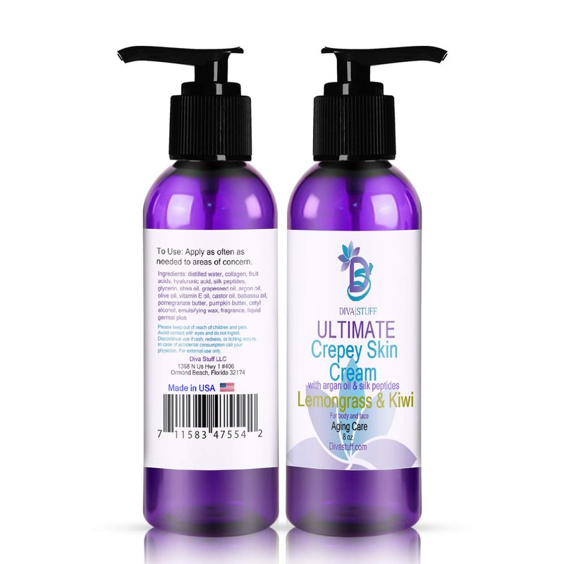 Anti-Aging, Intensely Moisturizing Cream It is "The Great Crepe Escape" in a bottle. Smooth away waffled and crepey looking skin with our plumping and hydrating lotion. Use it as a spot treatment on under eye wrinkles, crow’s feet, laugh lines, and other trouble spots on your face. Can also be used on the neck, decolletage, and other problem areas on the body. Do not apply all over the face if you are prone to acne. How To Use Apply to affected areas as often as possible. Do not rinse off. Ingredients Distilled Water, Honey, Glycerin, Alpha Hydroxy, Vitamin E, Hydrolyzed Collagen, Hyaluronic Acid, Olive Oil, Coconut Oil, Argan Oil, Almond Oil, Kukui Nut Oil, Macadamia Nut Oil, Soy Oil, Babassu Oil, Stearic Acid, Emulsifying Wax, Fragrance, Liquid Germall Plus Lifetime Satisfaction Guarantee We at Diva Stuff are on a mission to harness the power of potent, natural ingredients sourced from all over the world to bring products that take care of your body, beauty, and well-being. We're so confident you will love our products that if you're ever unsatisfied with your purchase, we will provide a full refund.