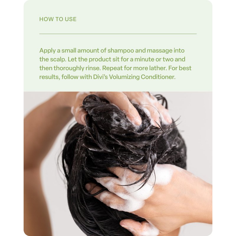 - EASY TO USE: Apply a small amount of shampoo and massage into the scalp. Let the product sit for a minute or two and then thoroughly rinse. Repeat for more lather. For best results, follow with Divi’s Volumizing Conditioner.