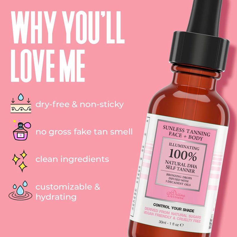 Divine Derriere Self Tanning Drops for Face - Self Tanner for A Maui Babe Body Glowing Tan - Body & Face Self Tanner Drops for a Natural Looking Self Tan, Sunless Tan, 1 fl oz.
