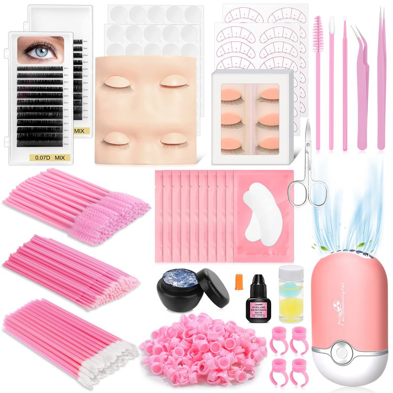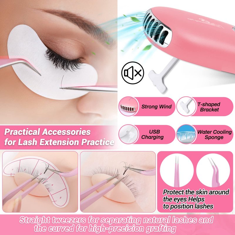 - [Enough Eyelash Extension Supplies for Beginners] The individual eyelashes are soft and like natural eyelash, and tweezers can accurately help you grip the eyelashes, which are convenient during a lash set. Five-point practice isolation paper can also ensure eyelash isolation quickly. The fan fast dryer provided is strong, glue sticker rings, eyelash glue, glue remover, tape and large quantity disposal cleaning stickers, lash brushes for multiple practice. All the pink aesthetics in the package.