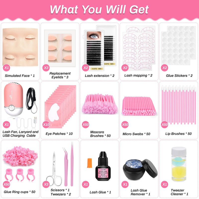 - [Eyelashes Extension Practice with Everything] The lash extension kit came well packaged in a cardboard box with 227 pcs Eyelash Extension supplies, which provided with everything needed to start practicing eyelash extension skills. The entire kit includes Mannequin Head, Removable Eyelids, Fan Dryer, Glue Rings, Eye Stickers, Scissor, Round Stickers, Eye Patches, Eyelash Extension Glue, Glue Remover, False Eyelashes, Tweezers Cleaner, Cotton Swabs, Mascara Brushes, Lip brushes, Tweezers.