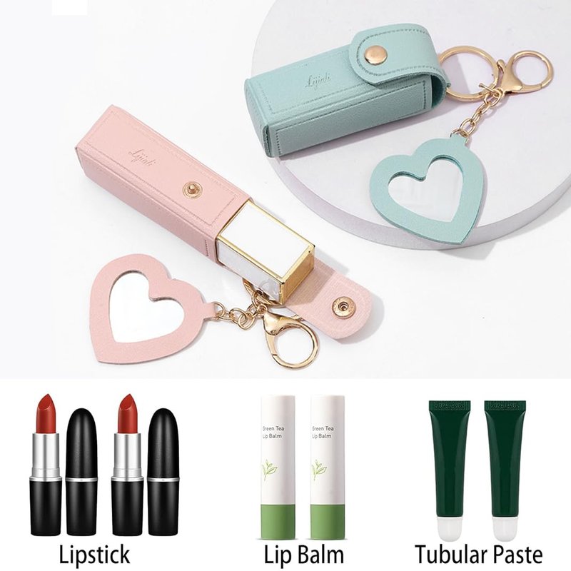 DIYBravo 2 pcs Lipstick Cases Keychain Chapstick Case Holder Lip Balm Sleeves Pouch with Mirror Heart Shaped, Portable Leather Lip Gloss Mini Bags Stocking Stuffers (pink+turquoise)