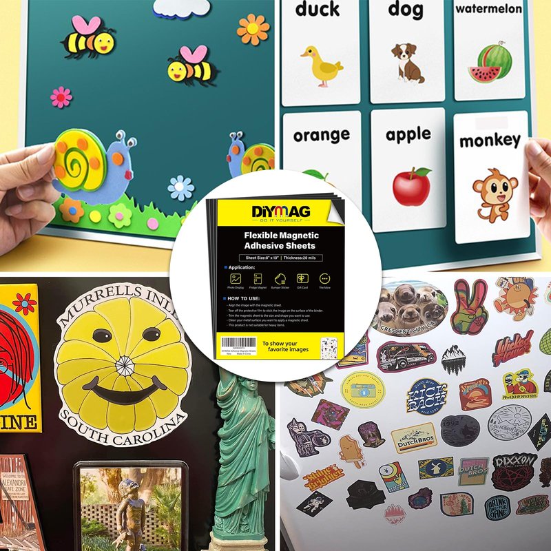 DIYMAG Adhesive Magnetic Sheets - |8" x 10"| 4 Packs| Align the image with the magnetic sheet,then,Tear off the protective film to stick the image on the surface of the binder, Trim the magnetic sheet to the size and shape you want to use,secondly,clean your metal surface you want to apply a magnetic sheet , Finally, the magnet sheet is attached to the metal surface. Attention Please , this magnetic sheet is not suitable for heavy items.