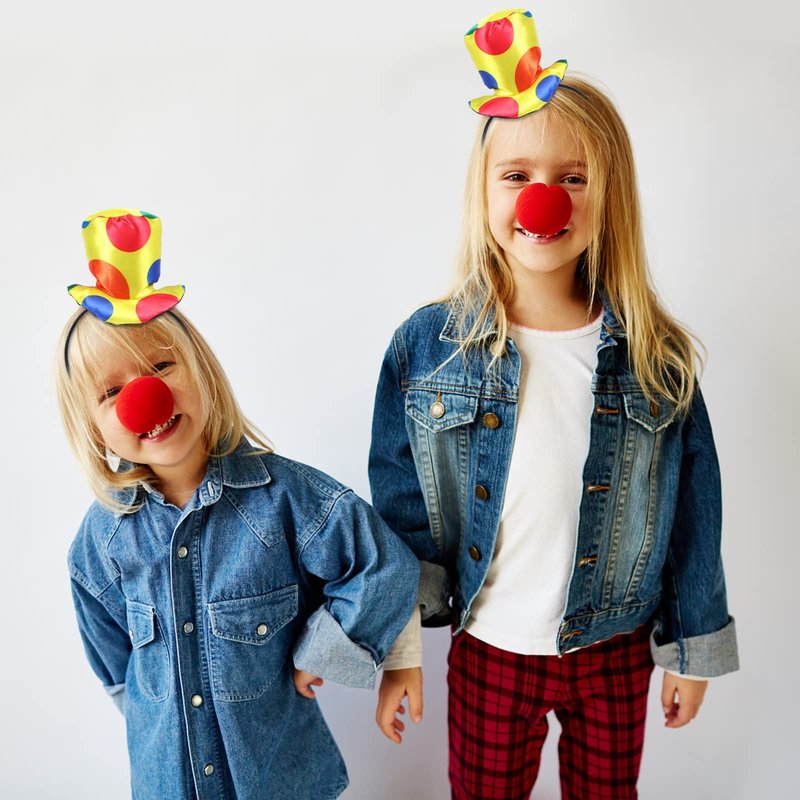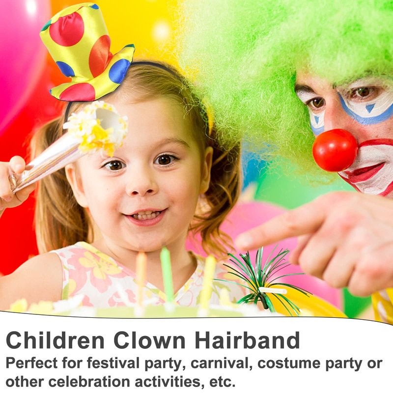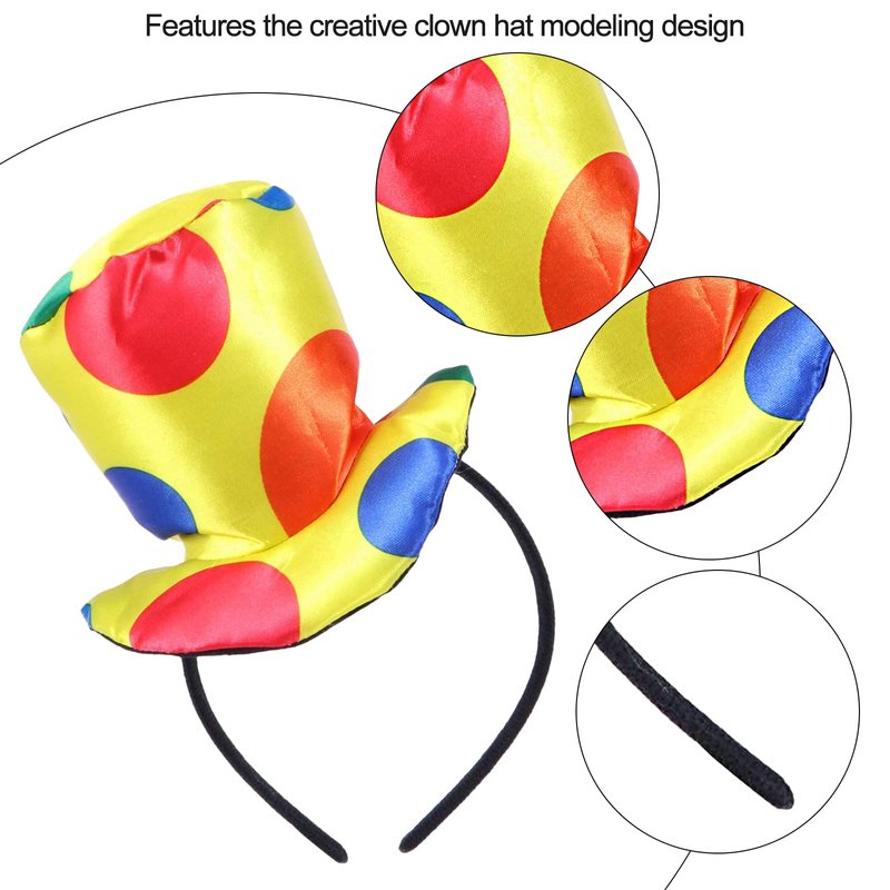 - đ€Ą ăClown Top Hat HeadbandăThe clown top hat headband is made of high quality cloth fabric.Padded headband with soft plush, durable and long-lasting use. Creative and exaggerated colorful round polka dot design. Make your costume more cute and adorable. Hat Height Approx. 4.33 x 5.71inch. One size fits most. Wont fall off easily from your head.