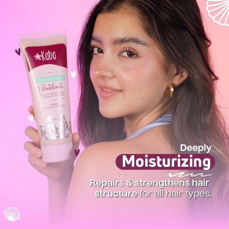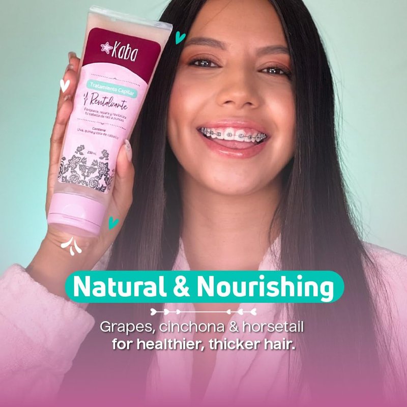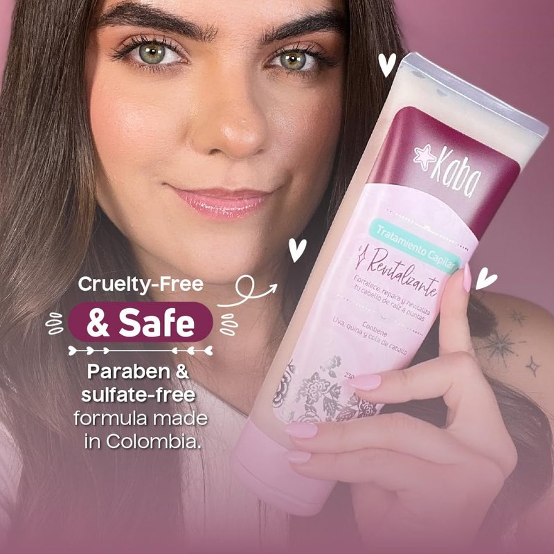 Our Kaba revitalizing hair treatment is the ultimate complement for your hair care routine. It restores your hair from roots making hair thicker, fuller, stronger and healthier. 100% natural, made of grapes,cinchona, and hoursetail, our hair treatment is perfect for all hair types. This hair treatment for dry damaged hair is perfect to repair damage, reduce tangles, and provide unmatched humidity-resistant frizz control. This treatment for thinning hair deeply moisturize and soften hair while repair and strengthen hair structure. It nourishes and rebuilds while cleansing your hair, ideal for chemically treated or recently dyed hair. Revitalizes hair giving it a healty volume and density. This Kaba thickening tratment helps stimulate hair follicle growth ensuring to provide the hair with all the necessary energy during the anagen phase (growth phase). This daily hydrating treatment cleanses and helps deliver deep nutrition and intense moisture to hair. Paraben, sulfate and cruelty-free. Contains 7.8 oz. Made in Colombia