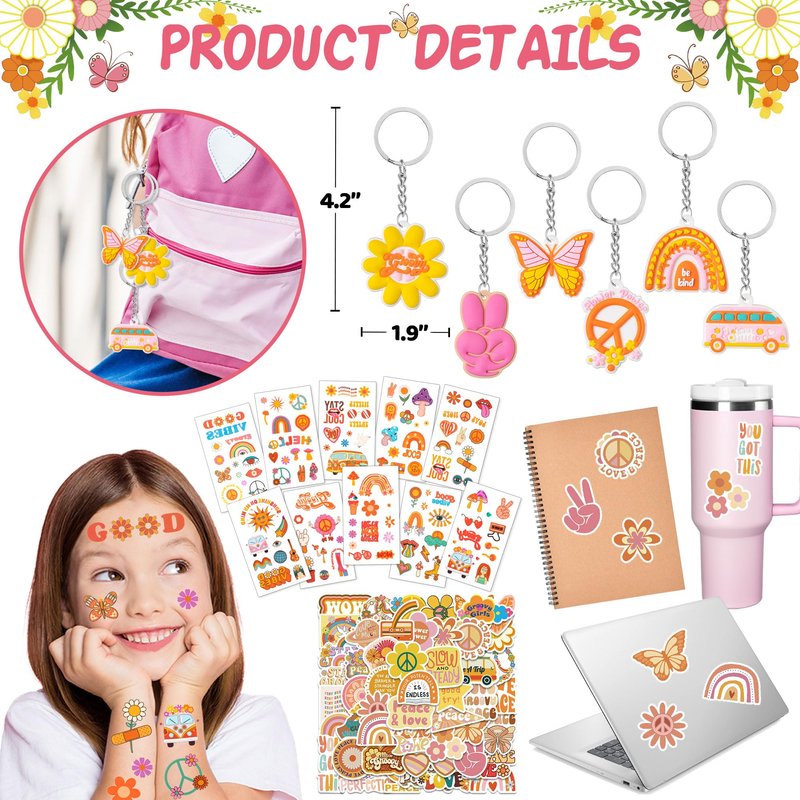 - Groovy Party Favors: 120 pieces including bus boxes, retro flower sunglasses, temporary tattoos, slap bracelets, keychains, plastic straws, and silicone bracelets.