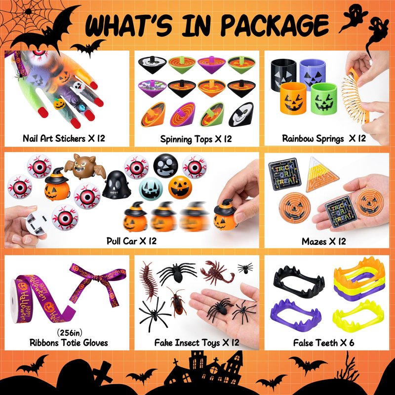 - GREAT HALLOWEEN PACK - Using toys as a Halloween candy alternative is a great option. Our Halloween party set includes popular Halloween toys, making it ideal for various Halloween activities and gifts. It is suitable for kids of all ages. By purchasing one Halloween pack, you will have at least 12 kids' Halloween gift bags covered, which saves you a lot of time