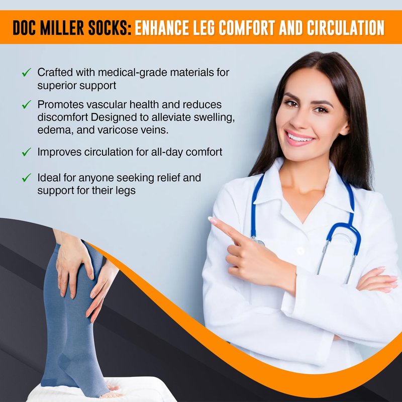 Discover unparalleled comfort and therapeutic benefits with Doc Miller Toeless Compression Stockings for Women and Men. Engineered with washable Nylon material, our medical-grade compression socks offer superior support and relief for various conditions, including calf and shin splints, spider and varicose veins, plantar fasciitis, and edema. Whether you're a dedicated athlete seeking enhanced muscle recovery or a hardworking professional in need of all-day comfort, our open-toe compression socks are your ultimate solution. Designed to promote circulation and alleviate discomfort, these compression stockings are perfect for pregnant women seeking relief from swelling and discomfort. Crafted with precision and care, they provide a snug yet comfortable fit, allowing for unrestricted movement throughout the day. Ideal for use with sportswear for added protection and strength, these socks are also a go-to choice for individuals with jobs that demand long hours on their feet. Choose from a wide array of colors and compression strengths to match your style and preferences. Whether you're looking for subtle neutrals or vibrant hues, our selection has something for everyone. With compression strengths ranging from 20-30mmHg, you can select the perfect level of support to meet your needs. At Doc Miller, we're committed to providing you with products that deliver exceptional results and unparalleled comfort. Our comprehensive collection includes not only open-toe compression socks but also full-length compression socks, thigh-high stockings, toeless compression sleeves, elbow braces, ankle sleeves, and calf sleeves. Available in various sizes, colors, and patterns, our products cater to diverse needs and preferences. Experience the difference with Doc Miller's open-toe 20-30mmHg compression stockings and discover the ultimate relief and support you deserve. Invest in your well-being today and elevate your comfort and performance with our compression solutions.