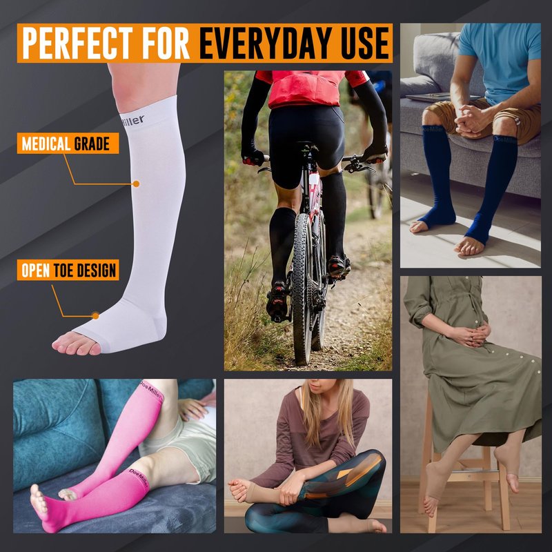 - COMFORT-ENHANCED MEDICAL GRADE COMPRESSION SOCKS: Experience unparalleled comfort and support with our meticulously crafted open toe compression socks. Made from high-quality nylon and spandex fabric, they offer breathable relief for conditions like calf and shin splints, varicose veins, and muscle soreness. With a diverse range of sizes and colors, find the perfect fit for lasting comfort throughout the day.