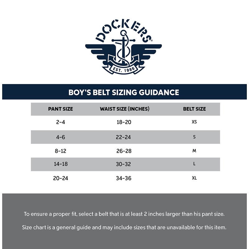 - DOCKERS QUALITY: Being the authority brand in khakis for more than 30 years give us a great background to know how to hold your pants. This Dockers boy’s belt features a sturdy construction that fits active children.
