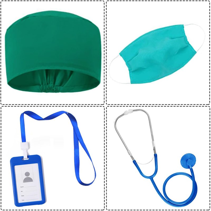 - Doctor scrubs set include: 1 x Scrubs, 1 x Trousers, 1 x Cap, 1 x Mask, 1 x Stethoscope Prop, 1 x ID card holder.