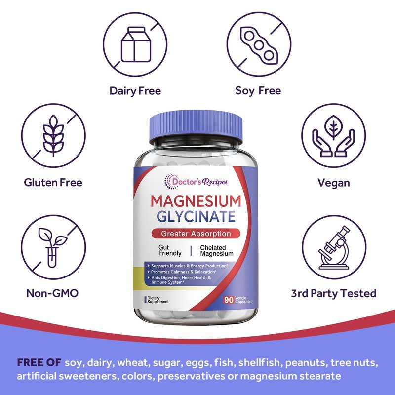 - Proudly Made In The USA: Our advanced strength formula is loaded with the highest grade & naturally sourced ingredients in a GMP certified facility in the USA. Doctor’s Recipes Magnesium Glycinate for men & women is 100% pure, natural, vegan friendly & NON-GMO with no soy, gluten and dairy.