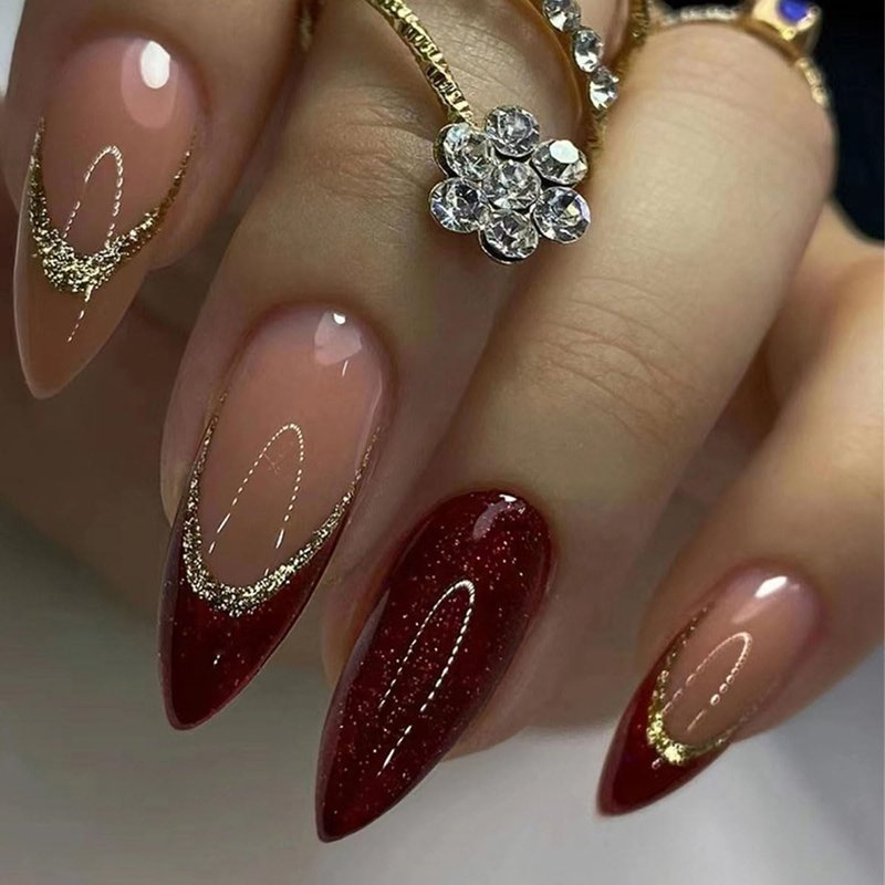 - 【Easy To Use】Choose fit false nails and stickers, stick them, and press them on. Without waiting at the nail salon, easily stick on nail salon at home. The french burgundy almond shaped acrylic press on nails full-cover manicure with gold glitter design for women are reusable