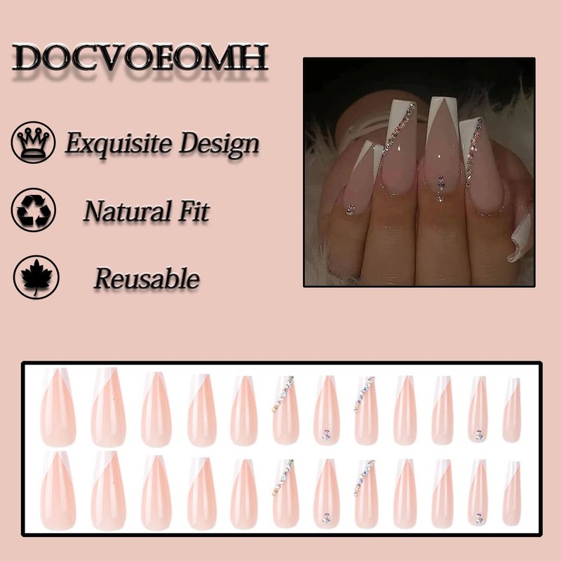 DOCVOEOMH French Tip Press on Nails Long Coffin Rhinestone White Fake Nails Pink Acrylic False Nails Shiny Glue on Nails for Women and Girls 24PCS