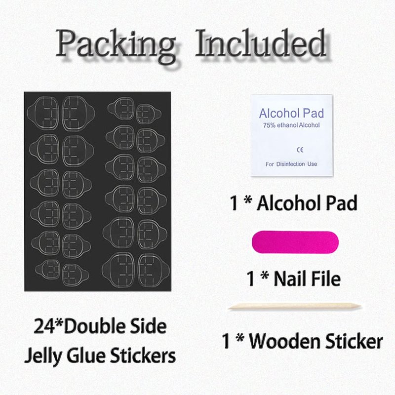 DOCVOEOMH press on nails long coffin package includes 24 full cover press on nails long square pieces in 12 sizes, 1 nail file, 1 nail glue sticker, 1 piece of 24 size jelly glue, 1 wooden stick for exfoliating and removing nail pieces Press on nails are easy to use,it only takes a few minutes to complete a manicure. Please feel free to send us a message if you have any question about our product, and we will reply you within 24 hours.