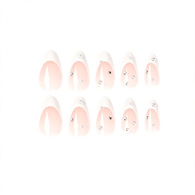 DOCVOEOMH French Tips Press on Nails Almond Shaped White Fake Nails with Rhinestones Design Medium Length Acrylic Glue on False Nail Stick on Nails for Women 24PCS