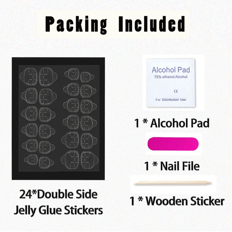 Packing Contains: DOCVOEOMH acrylic press on nails almond contains 24 pieces full cover glue on nails for women, 24 pieces adhesive nail jelly stickers, 1*mini nail file, and 1*wooden stick.
