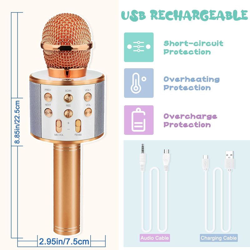 - LIGHTWEIGHT DESIGN: If you want to have a karaoke party with your kids, this microphone for kids can easily help you create a live atmosphere for parties. The portable karaoke microphone is light in design, which can be easily grasped by kids and carried around. Whether it is a birthday party, a family gathering or a singing contest between kids, this karaoke microphones can easily cope with it, bringing endless happiness to kids.