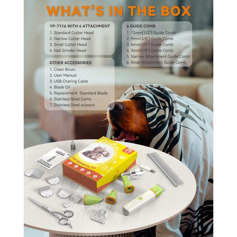 - The Same Money to Get Four: The 7116 dog and cat grooming kit adopts a detachable cutter head design with 4 replaceable cutter head attachments — standard cutter head,narrow cutter head,small(details) cutter head and nail grinder head, which can be quickly replaced with just one pull and one push to meet the needs of dog and cat body trimming. Save your money now!