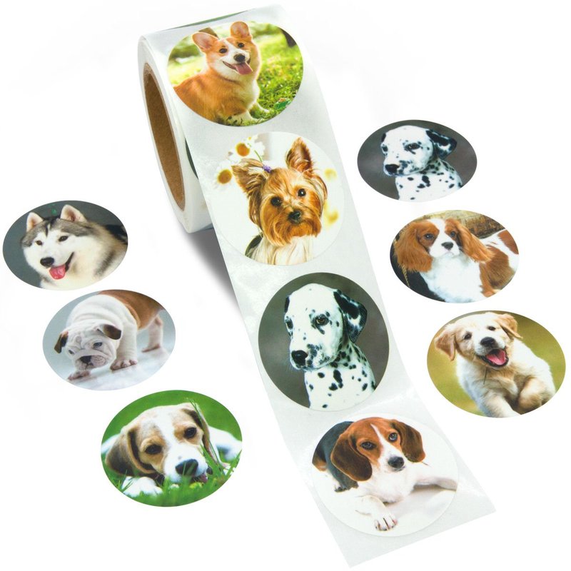 - What You Get - 9 cute dog design. Shrink-wrapped. 1 1/2". Paper. 200 stickers per roll.