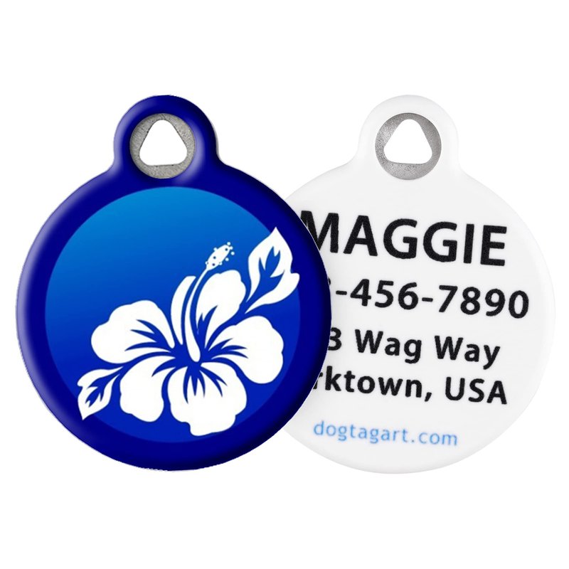 Dog Tag Art Blue Hibiscus Personalized Pet ID Tag for Dogs and Cats, Silent Polymer Coated Stainless Steel Nametag with Customized Identification Information, Small .875" Diameter
