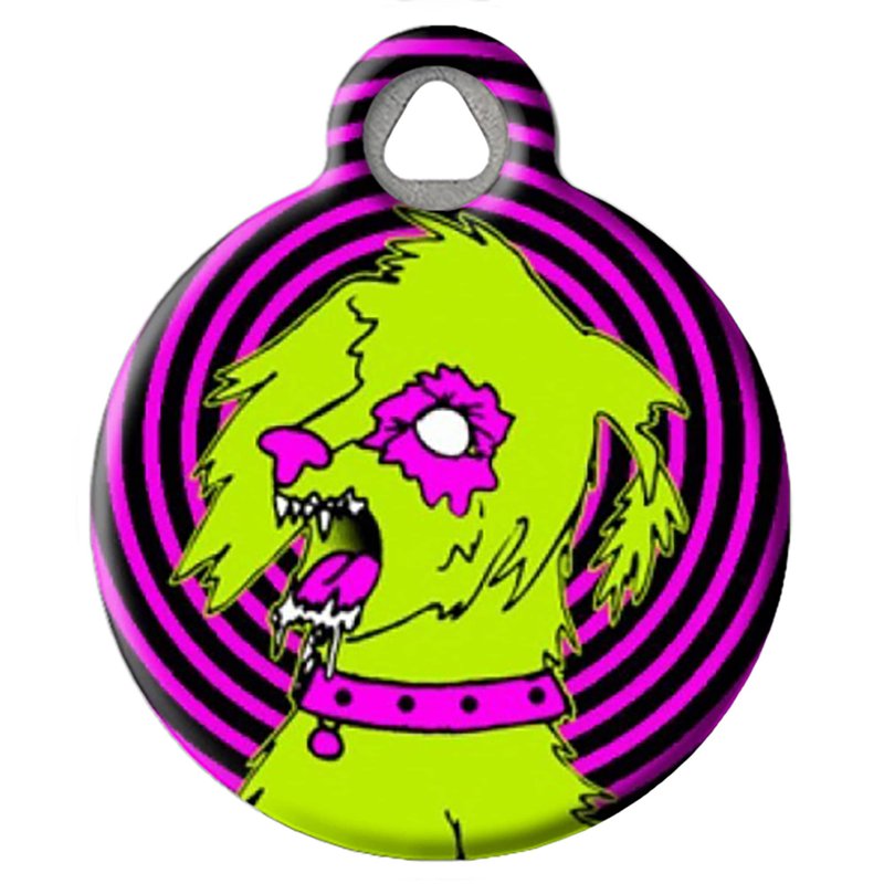 Get in the Halloween groove with these adorable zombie-themed tags for pets. From the Zombie Outbreak K9 Response Unit designs to the ultimate zombie street fighter tags, you'll love these funny dog tags year-round. Dog Tag Art pet ID tags are made of high-quality recycled stainless steel permanently infused with full-color graphics and personalized text guaranteed to not rub off over time, unlike cheaper competitors' dog name tags. With our innovative infused design, there are no glued or "sandwiched" materials that quickly wear out or fall apart. Our dog ID tags are fully customizable with your pet's name, your phone number, and other vital information. Our dog name tags also come with a robust key ring to easily attach the tag to your dog's or cat's collar. You can personalize these fun dog tags for collars for just about anything. Use them as traditional cat tags or dog ID tags or place one on your key ring with your house key, or attach them to your school backpack, purse, or luggage for fun, colorful flair. Dog Tag Art pet ID tags are illustrated and designed by artists from around the globe and made entirely in the United States. These cute dog tags are especially great for puppies and kittens that can get away from you quickly and get lost. Dog ID tags come in 2 sizes: Large: 1.25" (32 mm) in diameter (about the size of a half dollar); and Small: 7/8" (22 mm) in diameter (about the size of a nickel). The small pet tags are best for cats and little dogs, while the large size is more suitable for medium and large dogs. To customize the pet ID tag with your personal contact information, enter your custom text by selecting the "Customize Now" button. You have up to 4 lines of text for the back of your custom dog tag for pets and 20 characters per line. Purchase and personalize cute dog tags for every pet in the family!