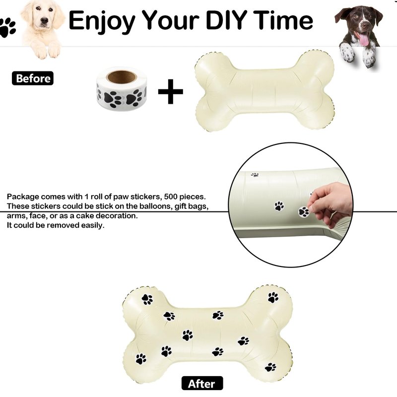 - What You Get: This puppy party decorations set includes 2pcs paw foil balloons(25.5 x 27.5" / 65 x 70cm), 2pcs bone foil balloons(17.5 x 29.5" / 45 x 75cm), 4 pcs w-o-o-f letter balloons(16"/ 40.5cm), 1 pc number 4 foil balloon(40" / 101.5cm), one roll of paw print stickers(1"/ 2.5cm, total 500pcs)