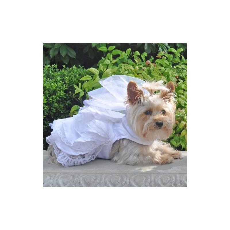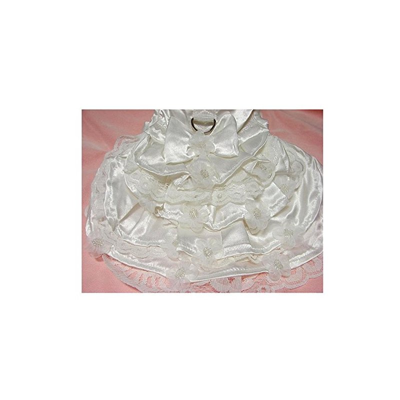 Your little bride will be so beautiful walking down the isle wearing this elegant fully lined, white satin and lace Bridal Gown Set. The gown has three tiers of skirting, each with an under-skirt of delicate white scalloped lace. The body of the dress is made from the highest quality white satin and is adorned with delicate white chiffon flowers, with pearl beads in the center. Each of these adorable little flowers has been hand sewn onto each of the three layers of skirting. This bridal gown set also comes with a matching wedding veil. The veil has a matching white satin head band, also adorned with the chiffon and pearl bead flowers and six layers of high quality Tulle. The six layers of Tulle can be separated to make this beautiful wedding veil very full and elegant (Picture shown with tulle layers separated). This set also includes a matching White Satin Leash. Available in sizes: XXS thru 2XL We have added a strip of Super Strong Nylon down the center, where the D-Ring is attached, for strength and security.