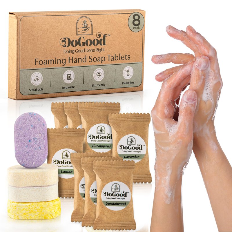 "Embrace Sustainability, One Wash at a Time: Introducing DoGood Foaming Hand Soap Tablets! ** Cultivating a Greener Future, Together:** At DoGood, we're driven by a passion for creating a positive environmental impact, while keeping eco-conscious choices accessible for everyone. We believe that fostering a healthy planet shouldn't come at a high price. That's why we're thrilled to introduce our pioneering product – scented foaming hand soap tablets! **Small Wonders for a Big Impact:** These innovative tablets offer a powerful combination of affordability and environmental responsibility. Crafted with gentle and natural ingredients and encased in 100% biodegradable packaging, these little wonders let you contribute to a planet-friendly future. Say goodbye to bulky plastic bottles and hello to a guilt-free clean! ✨ Quality You Can Trust, a Difference You Can Feel: At DoGood, quality is never a compromise. We believe that doing good shouldn't mean sacrificing excellence. Our affordable, zero-waste products are meticulously crafted, ensuring a delightful washing experience while leaving a positive footprint on our planet. We live by our motto – ""Doing Good Done Right."" ** Small Choices, Big Change:** We understand that embracing an eco-conscious lifestyle can seem daunting. But here's the good news: even small changes in your daily routine can create a significant impact. By choosing DoGood foaming hand soap tablets, you're contributing to a greener future, one wash at a time. ** Join the Movement: One Choice at a Time:** We invite you to join us in living sustainably with DoGood! With every choice you make, you can help create a brighter, cleaner future. Together, let's make eco-conscious living accessible and affordable for all."