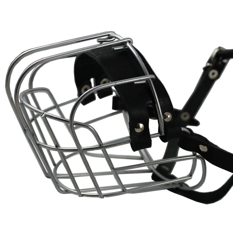 Comfortable and light, made of chromed wire and genuine leather, the straps are adjustable and won't stretch. This muzzle can be very useful in many situations - visits to a vet, off-leash walks, preventing eating off the ground, yet allow for panting and drinking, providing the ultimate in comfort and safety for both the dog and owner or trainer. Please measure your dog's snout to insure this is the correct muzzle size you need. Circumference 14", length 4.25".