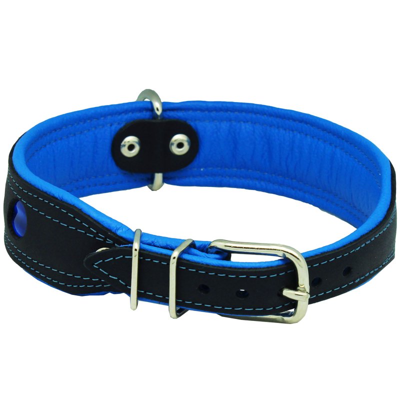 Dogs My Love Real Leather Soft Leather Padded Dog Collar Reflective (15"-17" Neck; 1.75" Wide, Black/Blue)