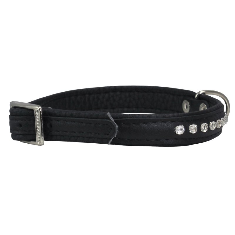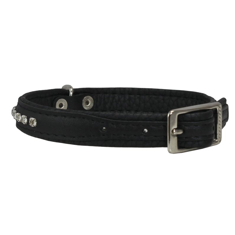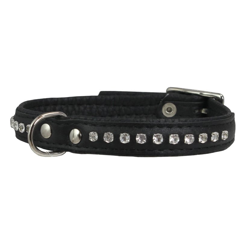 Gorgeous high quality dog collar. Pliable and strong, trimmed with thick waxed thread. Top surface made of high quality 100% genuine leather. Soft and comfortable black leather oversized padding. Crystal clear, sparkling rhinestone crystals are individually set. 1/2" wide. Features nickel-plated buckle and riveted center D-ring. 5 holes for adjustment. Available in 4 sizes and 6 color options. Designed for X-Small and Small dogs. Please measure dogs neck to ensure you order the correct size.