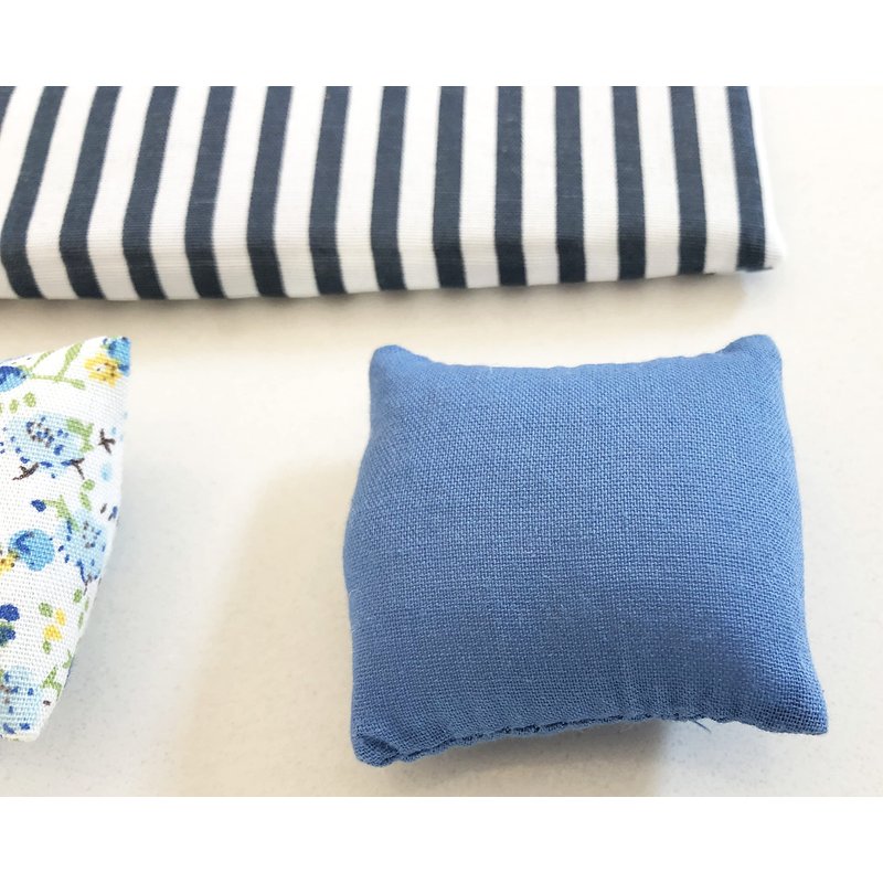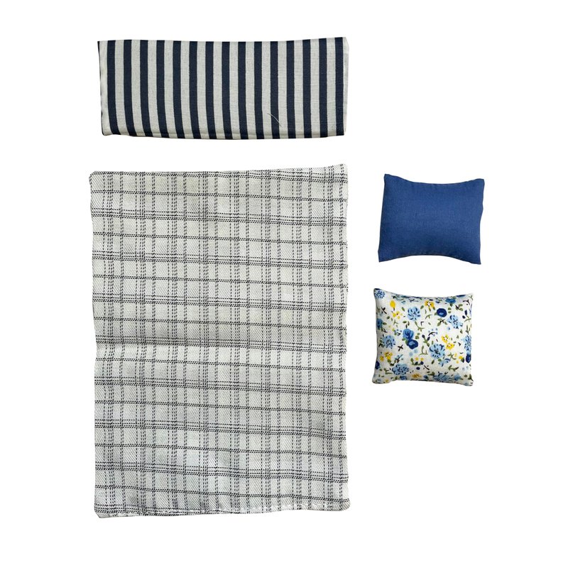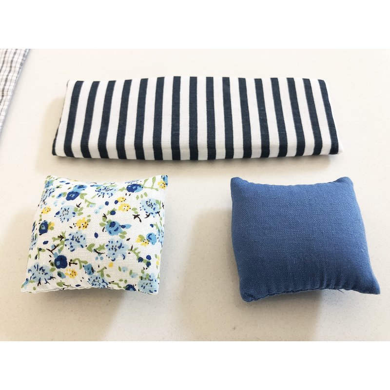 A beautiful and unique 4-piece bedroom bedding set for your dollhouse. This masterfully finished set consists of a comforter/blanket and three pillows. The comforter is finished on both sides with the same fabric. There are three pillows included in this set. Two are regular sized pillows, one is blue/navy, the other has a beautiful flower pattern. The third pillow is long and rectangular, and is white-navy striped. All pieces are in 1:12 scale and fit into any dolls house. They can be washed and the pillow cases can be removed as well to be used with other inserts.