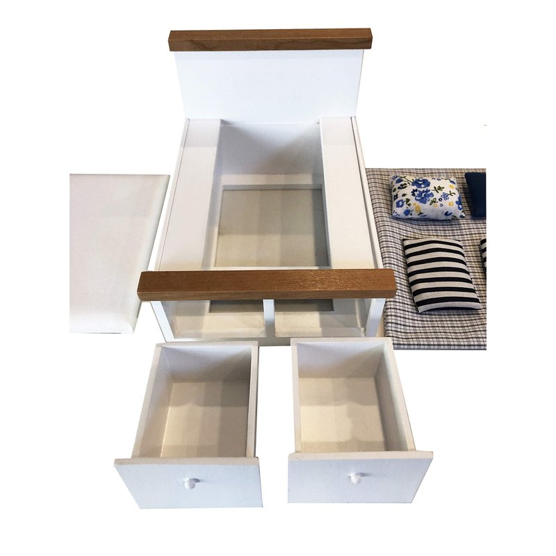 - Carved Details: This small modern doll house bed has two functional drawers at the foot of the bed. There are two brown decorative wood strips on the headboard and footboard make sure they don’t just look good but more realistic as well. The bed frame is painted in white.